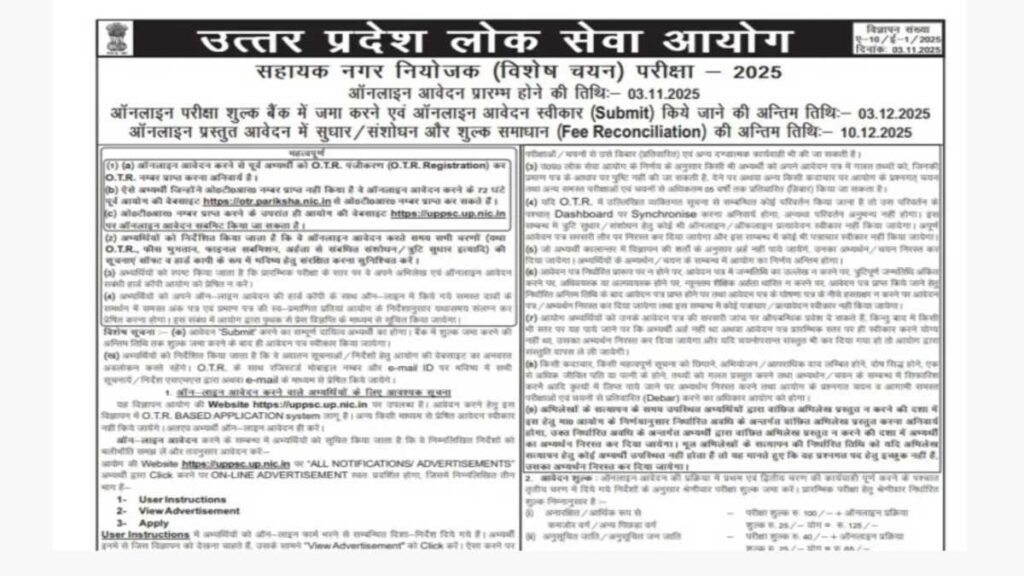 UPPSC Vacancy: उत्तर प्रदेश लोक सेवा आयोग ने एक साथ दो प्रमुख पदों पर भर्ती की घोषणा की है। एक सहायक नगर नियोजक (विशेष चयन) और दूसरा शोध सहायक (इंजीनियरिंग) के लिए। इस भर्ती प्रक्रिया में आठ सहायक नगर नियोजक और दो शोध सहायक के पद शामिल होंगे। इन पदों के लिए ऑनलाइन आवेदन प्रक्रिया 3 अक्टूबर से शुरू हो गई है। इच्छुक और योग्य उम्मीदवार uppsc.up.nic.in पर जाकर 3 दिसंबर तक ऑनलाइन आवेदन और शुल्क जमा कर सकते हैं। दोनों पदों के लिए फॉर्म में सुधार की अंतिम तिथि 10 दिसंबर, 2025 है।
